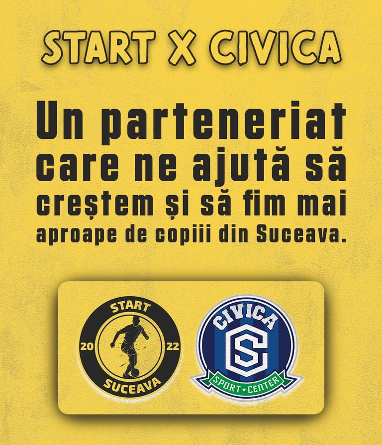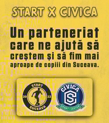 Clubul Start face un nou pas important în dezvoltarea activității sale printr-un parteneriat oficial cu Civica Sport Center, un parteneriat care ne oferă condițiile potrivite pentru a fi mai aproape de copiii și familiile din municipiul Suceava.